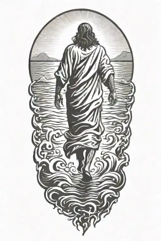 A Silhouette Of muscular Jesus Walking On Water, realistic, veiw from the back, Symbolizing Faith And Strength Tattoo