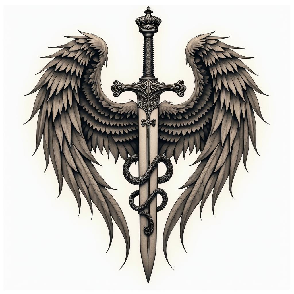 Back tattoo with wings across shoulder. A sword down the middle with two vipers along the blade and the sword handle with either a cross of crown designin victorian style tattoo, featuring vintage and elegant elements, ornate frames, roses, antique, sepia-toned color scheme