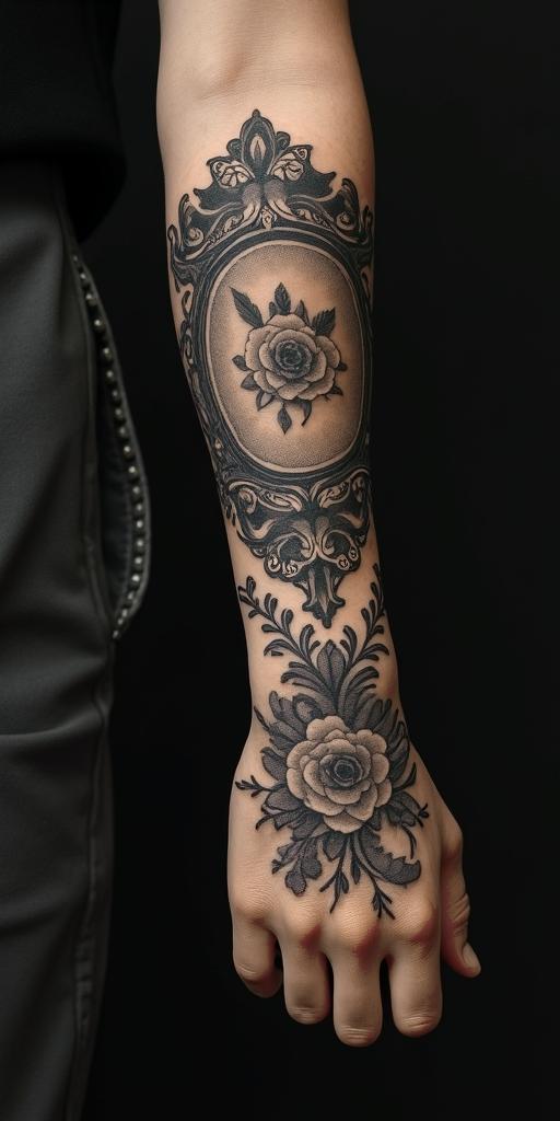 Victorian worrierin victorian style tattoo, featuring vintage and elegant elements, ornate frames, roses, antique, sepia-toned color scheme