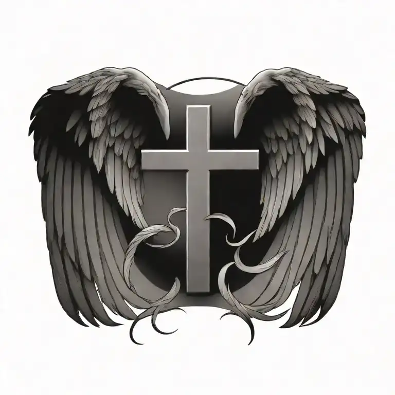 A tattoo design featuring a cross and angel wings intertwined, symbolizing the eternal struggle between good and evil